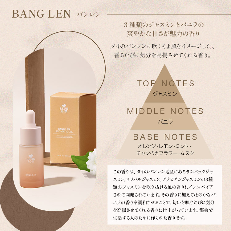 タイのバンレン地区にある「サンバックジャスミン・マラバルジャスミン・アラビアンジャスミン」3種類のジャスミンの花々の中を吹き抜ける、風の香りからインスパイアされた香りです。