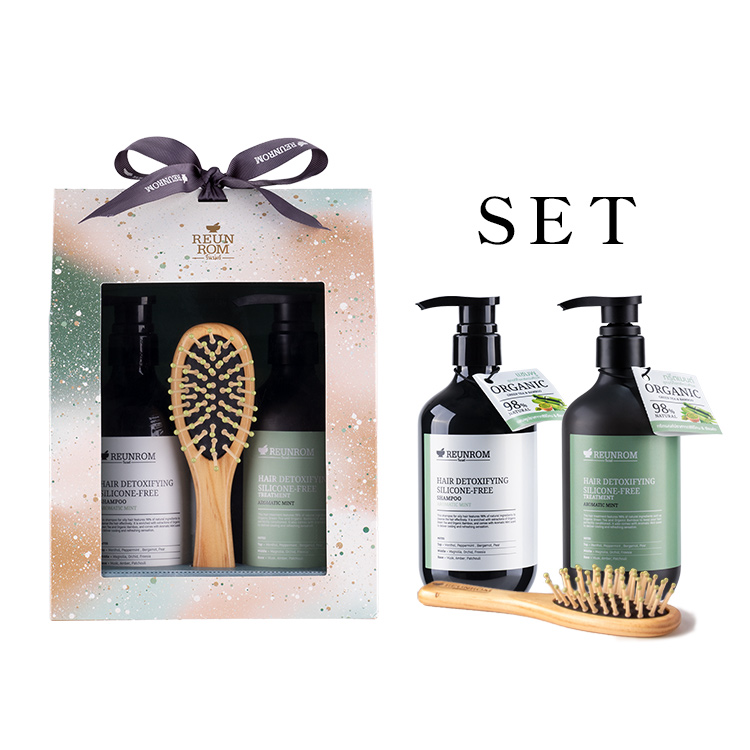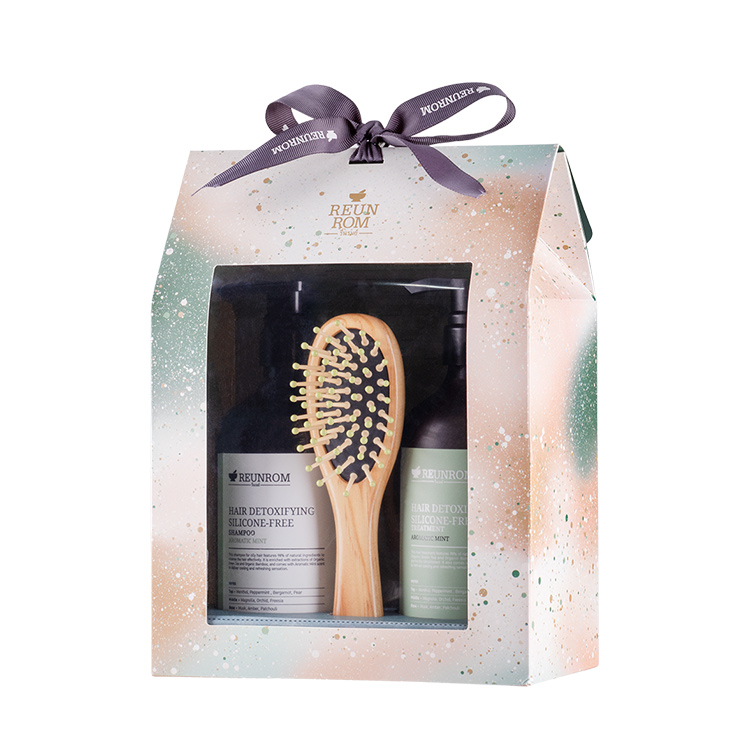シャンプー前のブラッシングにもピッタリな、高級感のある木製のヘアブラシが付いたギフトセット。ブラシの先が丸くなっており、頭皮を傷つけずにやさしくブラッシングができます。