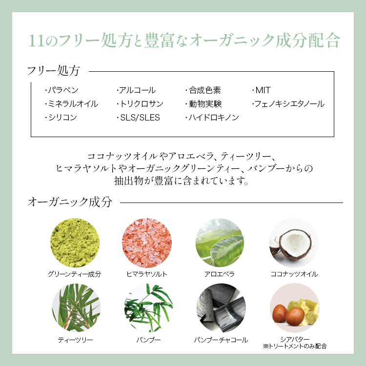 水、グリセリン、セテアリルアルコール、セタノール、ヤシ油、香料、ベヘントリモニウムクロリド、ベンジルアルコール、シア脂、グアーヒドロキシプロピルトリモニウムクロリド、メントール、チャ葉エキス、パンテノール、安息香酸Na、バンブサアルンジナセア茎エキス、炭、ティーツリー葉油、塩化Na、ソルビン酸K、EDTA-2Na、アロエベラ葉エキス