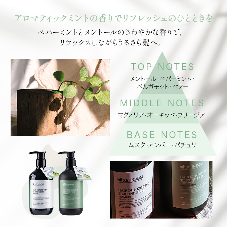 フケや痒み、ベタつき、ニオイの原因ともなる、毛穴の余分な皮脂詰まりを炭の力でスッキリ吸着オフ。天然成分98%使用のノンシリコン処方でありながら、オーガニックとは思えない、豊かな泡立ちで地肌の摩擦を防ぎ、メントール配合でスッと爽やかに洗い上げ、オーガニックとは思えないサラサラな指通りを実現する、アロマティックミントシリーズのシャンプー&トリートメントです。