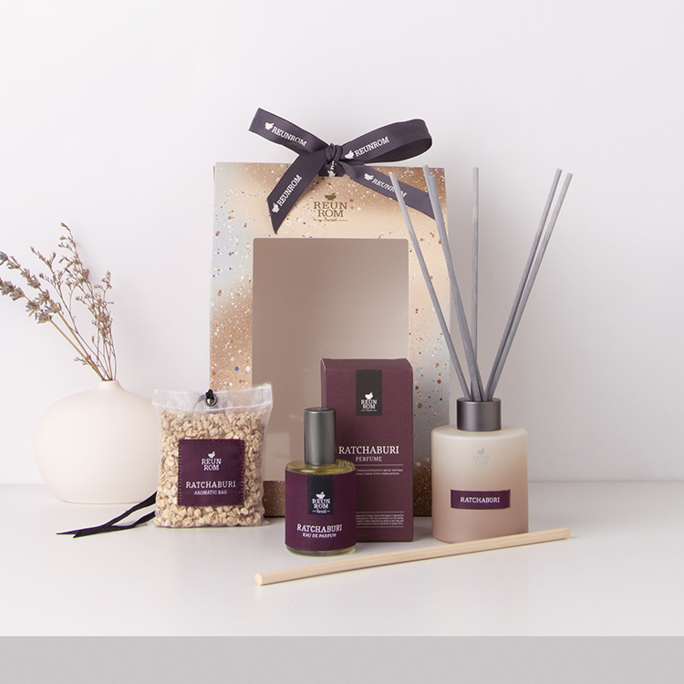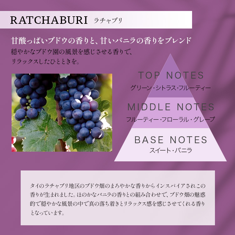 タイの有名なランドマークからインスピレーションを得たフレグランスシリーズがセットになったスペシャルギフト。自然豊かなタイのラチャブリ地区にある、ブドウ畑の芳醇な香りから着想を得た『ラチャブリ』。ブドウ畑の魅惑的で穏やかな風景の中で、心休まるひと時を感じられる香りとなっています。